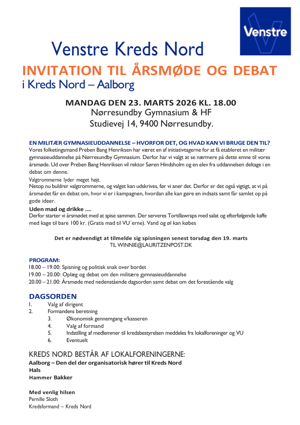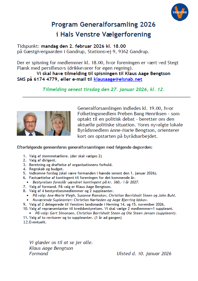 På denne side kan du læse mere om Venstre i dit lokalområde. Du kan blandt andet orientere dig om kommende arrangementer og finde oplysninger om den lokale bestyrelse.